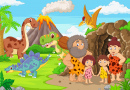 Group of Cartoon Cavemen and Dinosaurs